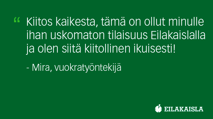 ”Kiitos kaikesta, tämä on ollut minulle ihan uskomaton tilaisuus Eilakaislalla ja olen siitä kiitollinen ikuisesti!” Tämä palaute vuokratyöntekijältä on vahva viesti vuokratyön tärkeästä asemasta työuran rakentumisessa. Vuokratyö on työnhakijalle paitsi joustava, myös mahdollistava valinta. Työnhakija voi hakeutua vuokratyön pariin monista syistä – se tarjoaa mahdollisuuksia erilaisiin elämäntilanteisiin, kuten opintojen tai yrittäjyyden oheen, uudelle uralle suunnatessa tai takaisin työelämään palatessa. Vuokratyö on usein tilaisuus kartuttaa monipuolisesti työkokemusta erilaisissa tehtävissä ja työyhteisöissä.